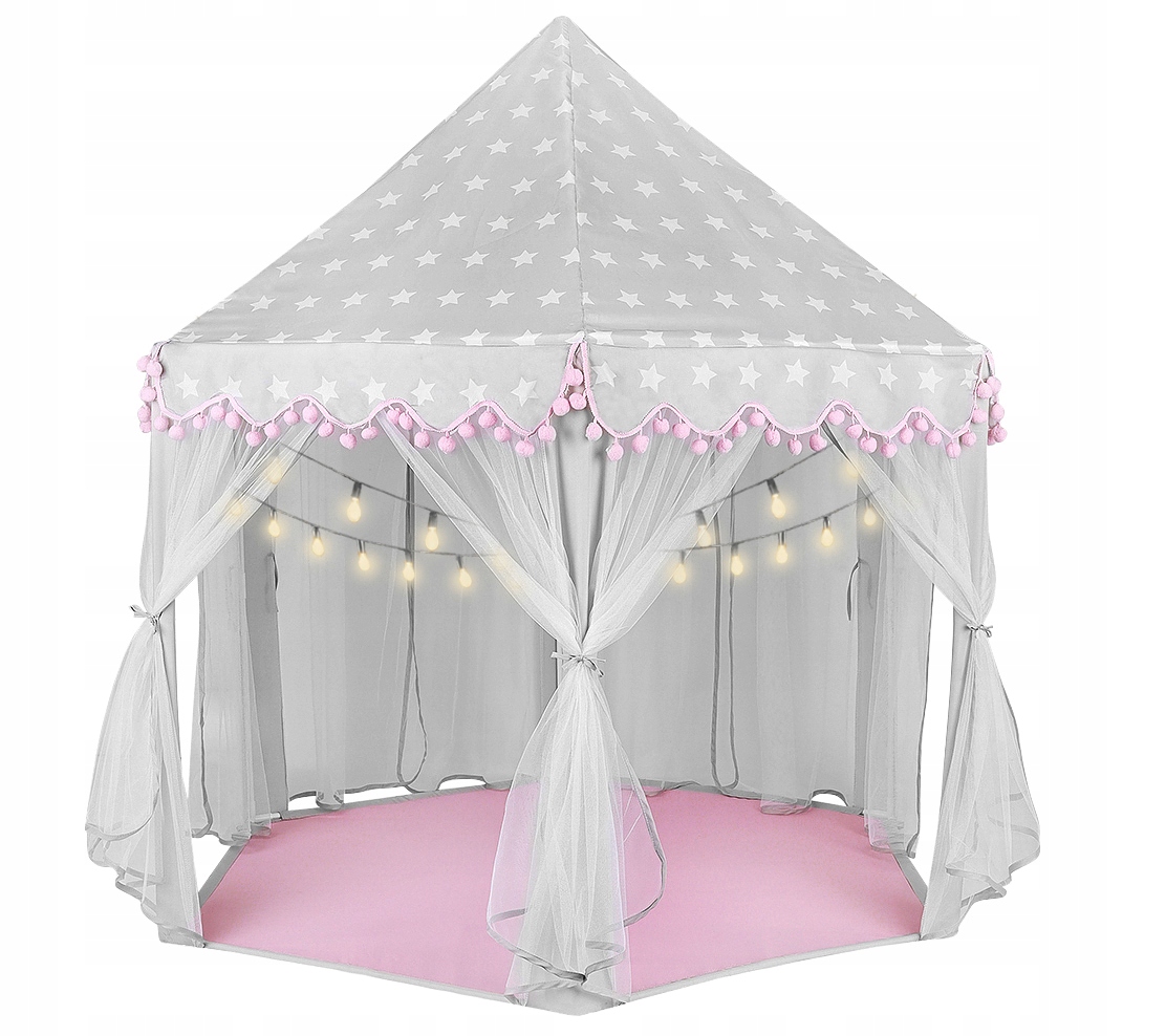 - НОВАЯ, УЛУЧШЕННАЯ МОДЕЛЬ - мы создали совершенно новую, улучшенную модель палатки. Мы использовали сочетание розового и серого цветов со звездным мотивом. Кроме того, на оборках есть красивые помпоны, которые делают его еще более привлекательным. Палатка имеет 6 входных отверстий и коническую крышу. В целом выглядит фантастически и прекрасно впишется в любую комнату .