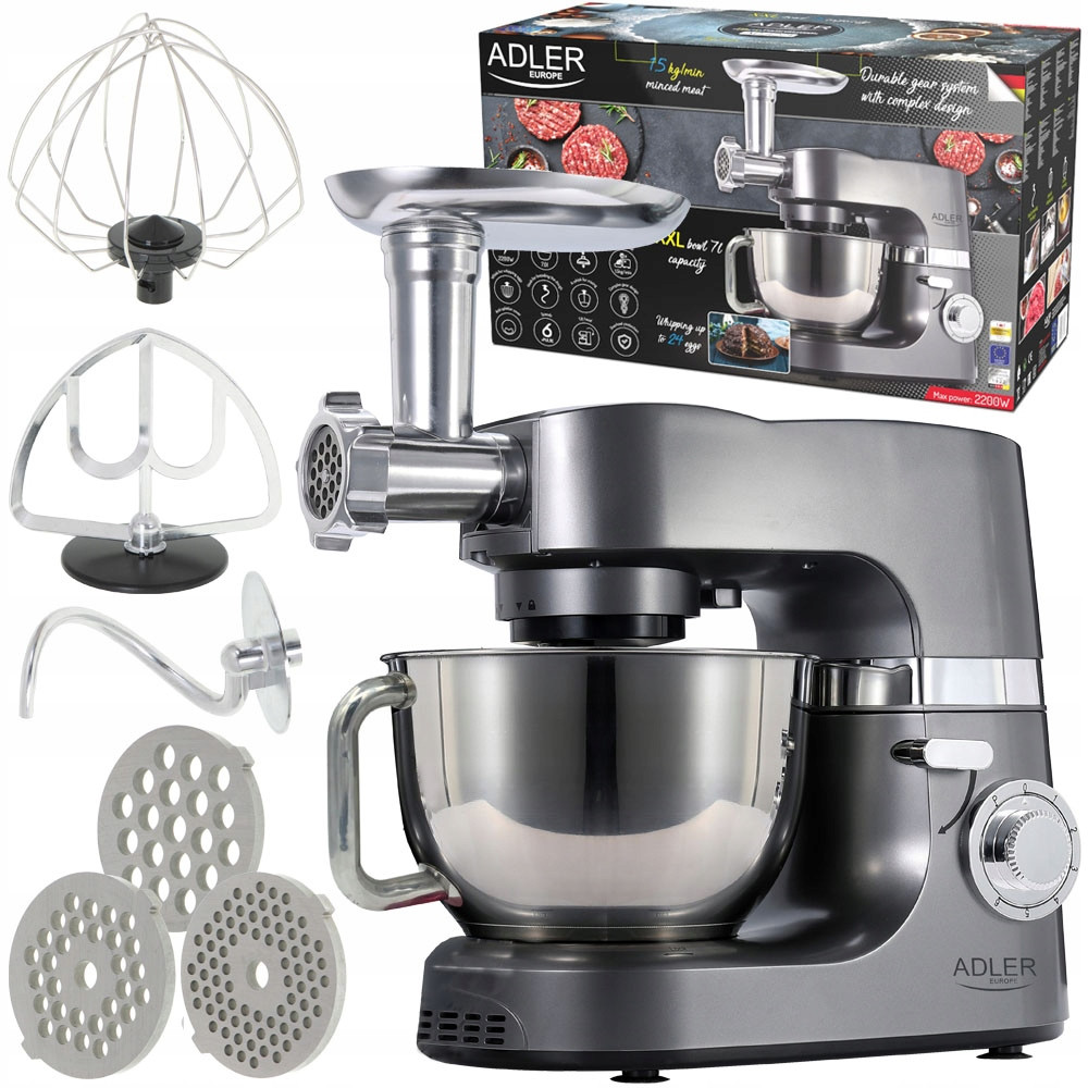 Adler AD 4221 – це потужний планетарний кухонний робот, який ідеально підходить як для любителів випічки, так і для тих, хто хоче урізноманітнити свій кулінарний репертуар. Завдяки високій потужності до 2200 Вт, великій чаші об’ємом 7 літрів і вбудованій м’ясорубці, цей робот впорається з будь-якими завданнями – від замішування тіста до переробки м’яса.
