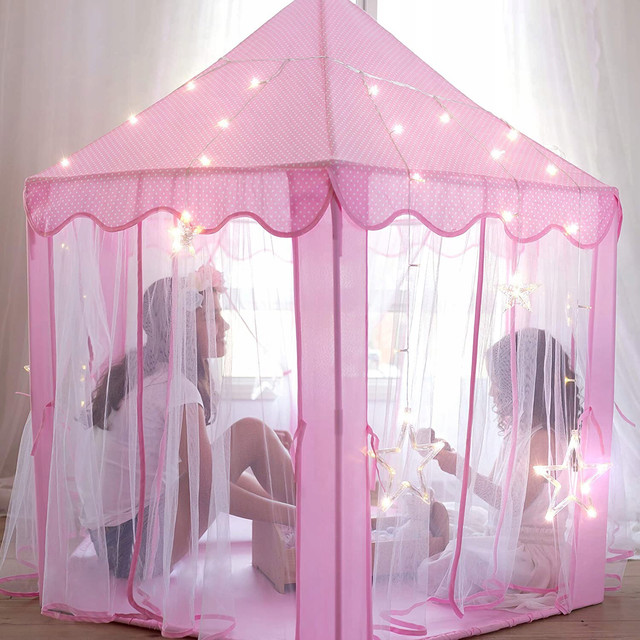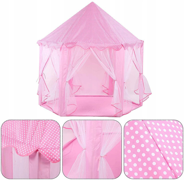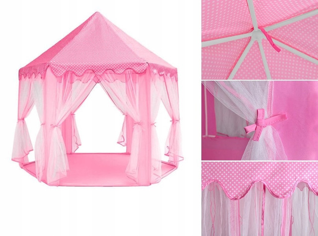 Намет-будиночок Kruzzel 23869 для дівчаток — рожевий палац із навісом, шестикутна форма, для дому та саду, прозорі штори, каркасна конструкція, компактна сумка для зберігання. Ідеальний для ігрової кімнати, балкона чи двору, дарує дитині казкову атмосферу та години творчих ігор.