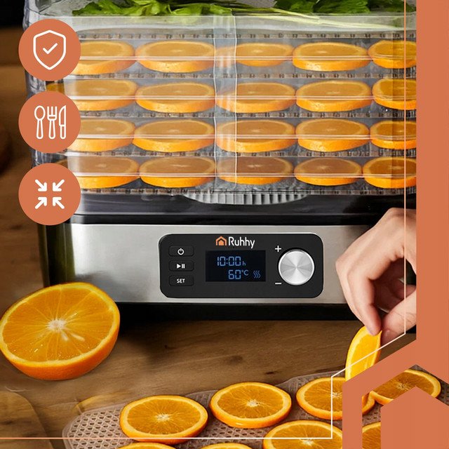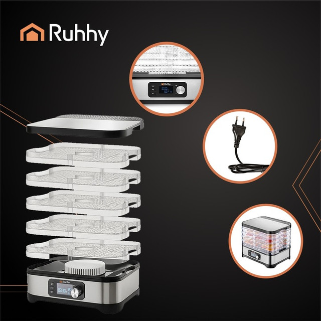 Сушарка Ruhhy 25928 — це універсальний дегідратор потужністю 400 Вт з 5 піддонами на 10 л, LCD-дисплеєм, таймером до 72 годин і точним термостатом (35–70 °C). В комплекті — лотки для рідин, антипригарні килимки, сита, ніж і щипці. Ідеальна для грибів, овочів, зелені, мʼяса, фруктів. Без BPA, відповідає стандартам ЄС — максимум можливостей для вашої кухні!